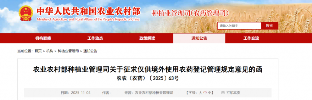 世界农化网中文网报道:2025年11月3日 ,为进一步规范农药出口管理,根据《农药管理条例》、《农药登记管理办法》有关要求,农业农村部种植业管理司发布关于征求仅供境外使用农药登记管理规定意见的函。
